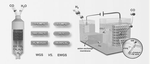 长期以来,科学家们都希望能发展更经济、更环境友好的方法,在温和条件下直接制备高纯氢气。邓德会团队经过长期探索,结合电化学反应原理,巧妙地将WGS的氧化还原反应拆分为彼此分离的两个半反应,首次提出了一种能在常温常压下直接制备高纯氢气的电化学水气变换概念。