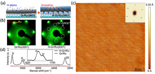石墨烯的发现以及其具有的独特性质和巨大的应用价值激发了人们对其他二维材料的研究热情。通过外来原子与本征石墨烯中的碳原子化学成键获得石墨烯功能化材料以及构筑新型类石墨烯二维原子晶体是扩充二维材料库重要途径之一。例如,所有碳原子与氢原子双面成键形成全氢化石墨烯结构,又称为“石墨烷”(graphane);氢原子和碳原子为1:2的单面氢化石墨烯,文献报道中称为“graphone”。然而,目前在实验上制备大面积高质量的氢化石墨烯的工作仍很稀少,实现材料结构和物性的调控仍很困难。