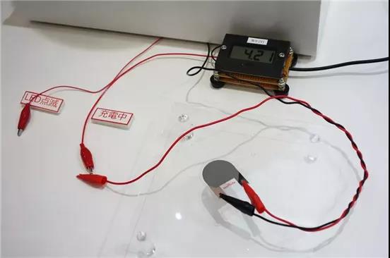 在展台上,村田制作所向参观者展示了实际产生的电压,以及作为充电电池的充电功能。这种尺寸只有15×15×0.05mm 的电池,可以在 50微Ah的容量、平均3.0V的电压下使用。