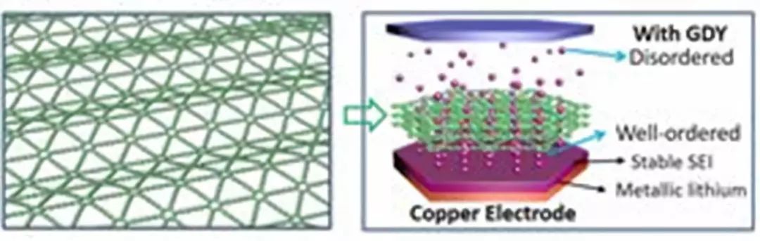 石墨炔结构(左图)及其在抑制锂金属电池中锂枝晶生长的应用(右图)