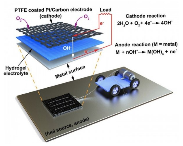 该阴极则由碳组成并伴有聚四氟乙烯(PTFE)涂层及纳米级铂嵌入其中。电解质是一种含有盐水的水凝胶。当这种胶状的物质被拖到金属表面时其就会氧化金属表面以下的部分、分解化学键为其自身提供能量。与此同时,阴极材料正在减少其上方空气中的氧气。