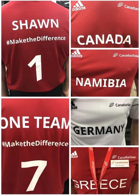 作为一家全球化企业,阿特斯在全球20多家国家和地区建立了子公司和分支机构。阿特斯欧洲分公司成立于2009年,目前团队成员近80名,来自全球28个国家。阿特斯展位上着定制球衣的工作人员,胸前的国家名称代表着每个人的国籍。