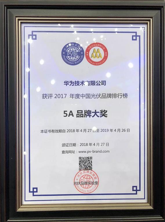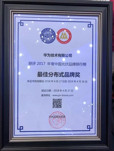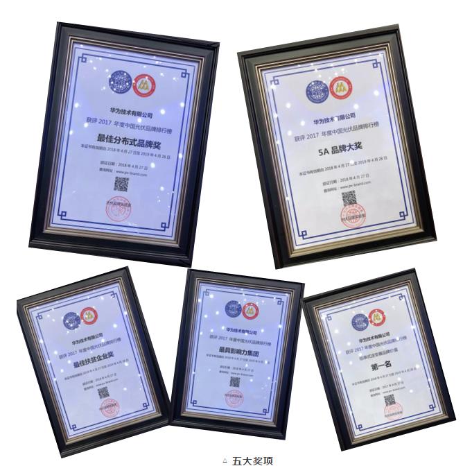 4月27日,备受瞩目的“中国光伏品牌排行榜”颁奖盛典在上海卓美亚喜马拉雅酒店盛大开启。华为智能光伏从众多参评企业中脱颖而出,一举斩获 “2017最佳分布式品牌”、“2017最佳扶贫企业”、“2017最佳5A品牌”、“2017最具影响力集团”、“2017组串式逆变器品牌价值10强第一名”等五项大奖,多项榜单高居首位。这不仅是客户、合作伙伴和光伏同仁对智能光伏的充分认可,更彰显了华为的品牌影响力和强大行业领导力。而荣耀的背后是华为持续不断的创新,和为客户提供引领行业的高品质的产品和服务。