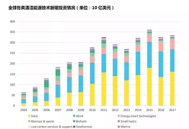 据彭博新能源财经最新年度数据显示,2017年,全球可再生能源和能源智能技术的总投资达3335亿美元,较2016年修正后的3246亿美元增长3%,仅与2015年历史峰值3603亿美元有7%的差距。