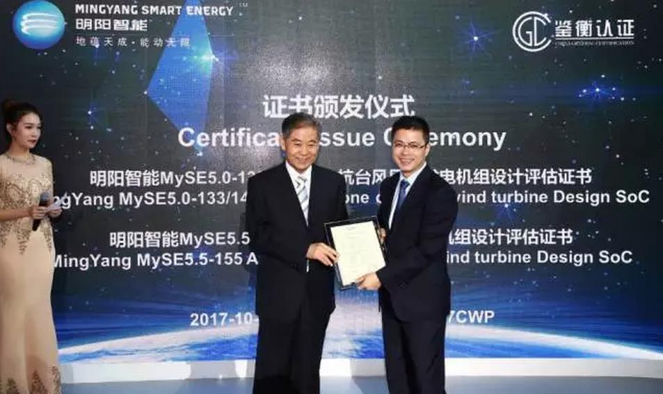 好产品要经过权威认证机构的认可,才能被客户和市场认可接受,明阳每次推出优质的产品都取得了国际国内权威认证机构的认可,比如,2014年北京风能展上,全球权威认证机构DNV-GL给明阳颁发了全球首个按照最严标准GL2010完成的MY1.5-89型式认证;2015年北京风能展上,鉴衡认证和TUV莱茵联合给明阳颁发了全球首个按照创新认证模式“一次认证两张证书”完成的MY2.0-121设计评估证书;2016年北京风能展上,鉴衡认证给明阳颁发了全球最具创新技术的半直驱机组MySE3.0-121型式认证和MySE3.0-135认证证书,今年明阳智能推出的新产品毫无例外也得到了权威认证机构鉴衡认证的认可,本次展会现场由北京鉴衡认证中心向明阳智能颁发了MyS2.5-135型式认证,MySE2.75/3.0/3.2-145设计评估,MySE5.0-133/140和MySE5.5-155设计评估证书。MySE系列机组的发布和获证,意味着它已经满足各项标准化要求,将会对后期市场投标起到坚实的支撑作用。