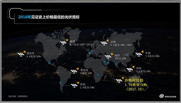 从去年开始,我们已经看到了整个光伏行业的成本下降是非常非常快,大家可以从结果上来看,2016年全球各地已经出现了非常有竞争力的光伏竞标的价格,大家可以看到像墨西哥、智利、阿联酋的迪拜已经报出了非常非常低光伏的竞标价格,就在两周前沙特1.79美分,现在是史上最低的竞标价格,而且这个价格也是低于全球范围内风电目前最低的竞标价格。中国在这样的大潮中,为整个全球的事业,不仅是中国光伏事业,都做出了非常大的贡献,从设备端、制造端,从风电设备来看,过去20年每年基本以8%成本的下降,光伏设备的成本可能是更可观,每年以15%的速度在下降,而且可能到2020年,这个价格可能会突破所有人的预期。这里我们有一些预判,到2020年,光伏度电成本可能会在4到5美分,已经算比较保守估计了,相当于原油价格25美元一桶,到2050年会更低,到那个时候真的是传统能源已经没有它的用武之地了,因为可再生能源,尤其是光伏、风电的成本和价格已经到了非常非常低的水平。
