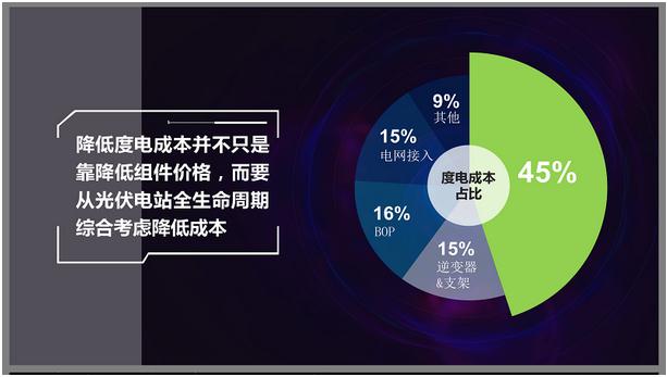 这里面也有一个比较讽刺的事实是,中国却恰恰是全球范围内度电成本最高的国家之一,虽然我们为全球做了这么多贡献,但是在全球的范围内,我们的度电成本特别高,我看了一个数据,现在印度都比我们低,在光伏这一块,当然我们也在分析一些原因吧,因为我们今天讲的主要是度电成本,前面王老师也讲了要看度电成本不只是看一开始的初期投资,但是仔细一看,其实组件的成本也只是占整个度电成本的一半左右,所以我们前面提了这么多的组件增效、组件技术的突破其实也不够,因为真正要降低整个度电成本,可能光从组件本身突破远远还不够,所以为什么我会提今天这样的课题,因为大家看到随着现在物联网的技术、大数据、云计算、软件的技术,ICT技术的崛起,能够帮助我们重新思考、重新系统化的去降低光伏电站整个全生命周期的度电成本,而且贯穿整个全生命周期,从设计到工程,到运行维护,甚至还有交易,未来电站交易也会变得更加频繁。