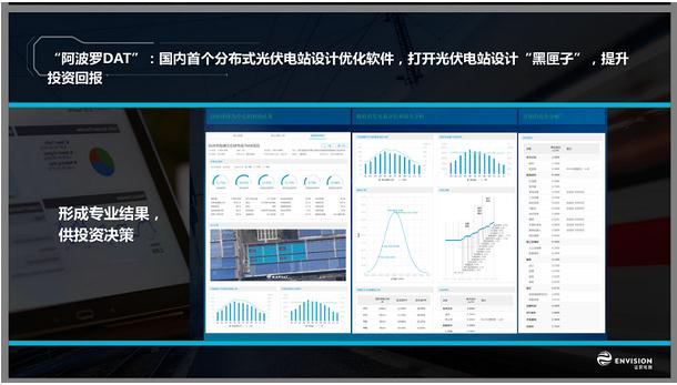 我想跟大家分享一下,远景阿波罗光伏在这个里面其实也做了非常多的探索跟创新,比如在设计阶段,我们自己开发了国内第一个针对分布式电站设计优化的工具,以前大家会用PvSyst,它有它的优势,但是也有很大的劣势,是否能够适应中国分布式的开发,一直是大家比较诟病的,我们也是看到了这样的情况,我们也是觉得完全有必要做一个符合中国分布式开发的工具,尤其在一开始找屋顶,做整个的评价,在整个投资决策过程中,我们需要这样的一些基于软件技术的工具,能快速的帮我们优选出可以投资的电站。当然这个背后其实有很多的算法、模型、数据,界面是比较简单,其实背后结合了很多数据层,像GPS数据、天气数据、设备数据、电价数据,包括背后非常多的物理模型、算法,在整个简单易用的工具背后是有非常大的深厚的技术基础在那里。当然这个系统其实我们也是希望大家能够广泛使用,这样能够帮助工具做更好的优化,因为很多的设计效率都是越积累精度会越高,所以这是在设计的阶段。