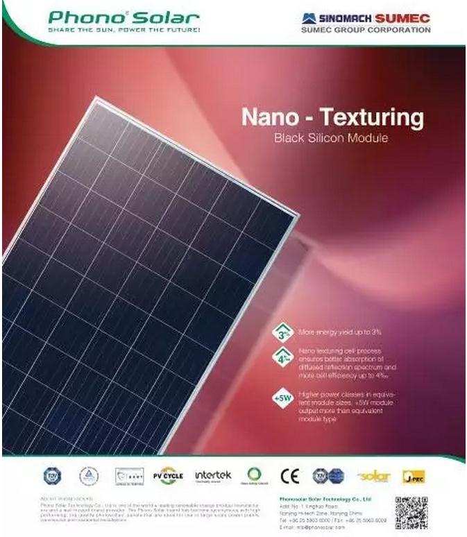 其中,获得专利保护的纳米制绒技术组件(Nano系列),拥有全球独有的“钻石”形纳米陷光坑洞,可有效地利用清晨和傍晚时段的散射阳光。已于6月开始量产的Nano系列组件,在成本不变的情况下,比常规组件多发电3%(绝对值)。