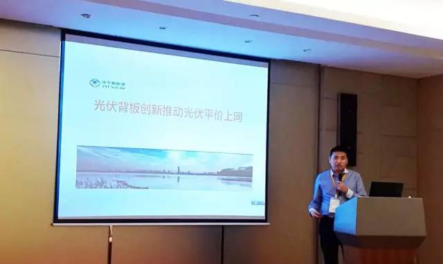 中天光伏材料有限公司技术经理季明龙在大会上表示,光伏发电平价上网是每个光伏从业者追求的梦想,光伏背板作为组件重要的封装材料,对于保障光伏电站寿命、推动平价上网起着至关重要的作用。随着光伏平价上网时代的逐渐到来,光伏行业亟需一种既能够保障光伏组件寿命,又能为电站带来额外收益的“理想”背板。中天光伏材料有限公司通过产品创新、质量创新与材料创新为光伏组件、电站领跑助跑,推动光伏平价上网。