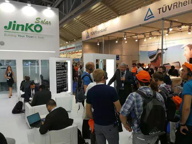 简洁的展台设计与新组件的展示,晶科能源在今年的InterSolar 欧洲展会展现出了行业第一的国际化的品牌形象。晶科首次展出半片组件和PERC MX组件,展位人头攒动热闹非凡,是本次展会中最闪亮的焦点之一。