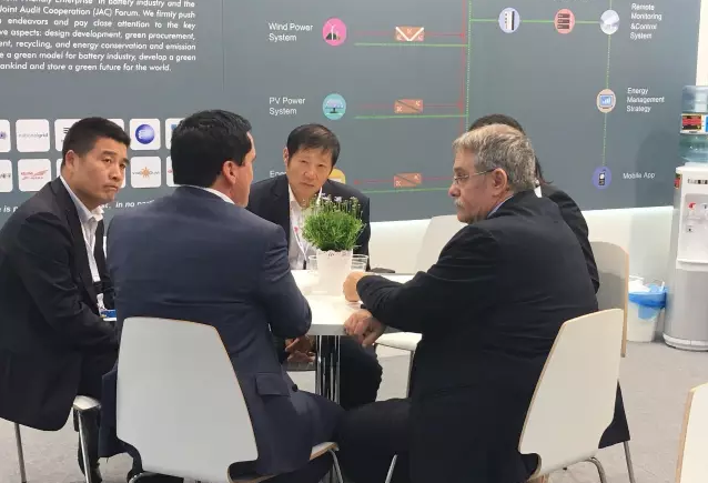 ▲双登集团董事长杨善基先生与来访客户交流