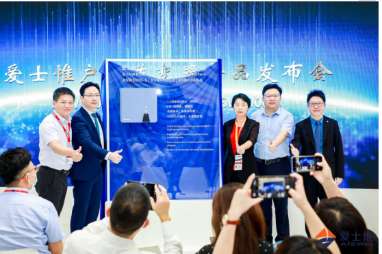 爱士惟新能源技术(江苏)有限公司总裁张勇博士和无锡市贸促会会长、会展办主任、中国能源研究会常务理事徐惠娟女士、德国莱茵TÜV全球电力电子产品服务副总裁兼大中华区太阳能与商业产品服务总经理李卫春先生、无锡尚德太阳能电力有限公司执行总裁何双权先生,展宇光伏科技(中国)有限公司总裁宋钰先生, 共同为爱士惟ASW3000-S/4000-S/5000-S明星户用逆变器揭幕。