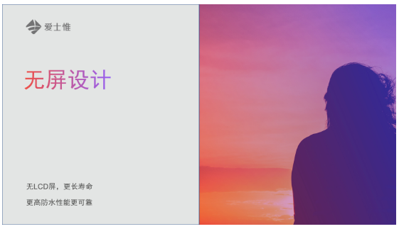 无屏设计,彻底免除LCD屏对系统寿命的影响,更好防水,更长寿命,更高可靠性。