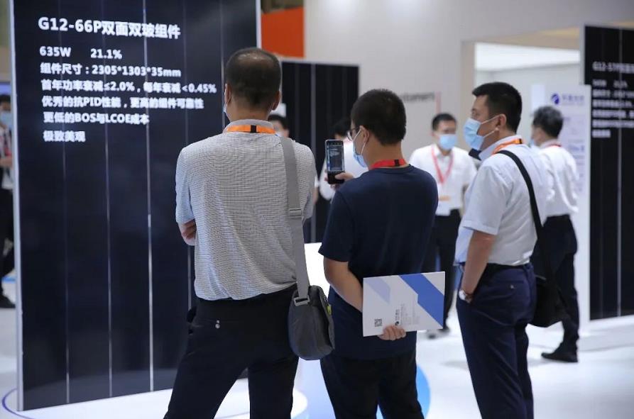 G12、叠瓦双平台技术加持下的G12-66P双面双玻组件功率可达635W,转换效率21.1%,首年功率衰减≤2.0%,每年衰减<0.45%。更强的抗PID性能,更低BOS和LCOE成本,更高的组件可靠性。吸引了众多参展人驻足观看,详细询问,是本次展会当之无愧的“吸睛高手”!
