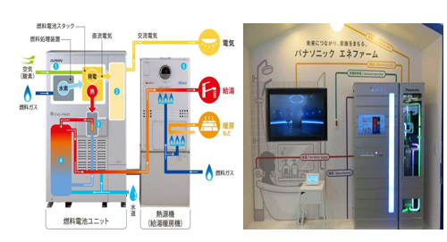 氢燃料-热电联产系统ENE-FARM是一种在家庭或商业中高效利用的能源系统。它将氢气注入燃料电池中发电,发电时产生的热能来供应暖气和热水,整体能源效率可达90%。不依赖现有电网,可在大规模停电时应急使用,并且几乎没有输电损失。