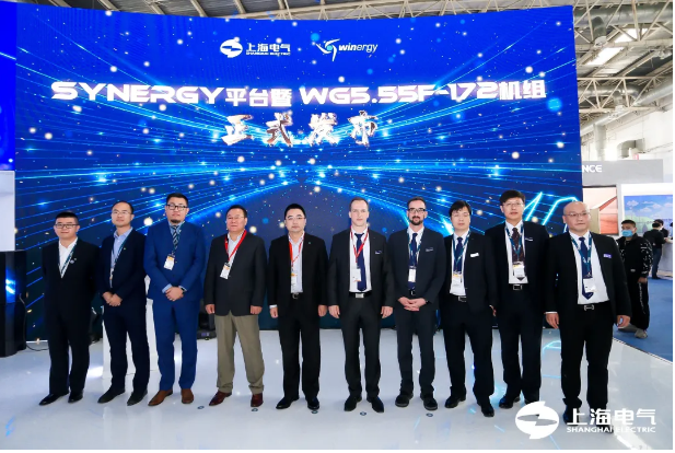14日上午,上海电气在展位举行海上风机新品发布仪式,现场发布“Synergy”平台产品WG5.55F-172机组海上风机新机型。风电集团与威能极中国相关领导参加仪式。
