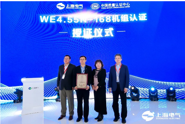 上海电气WE4.55N-168机组在中国质量认证中心完成了初步认证,标志着上海电气新机型的设计获得第三方权威机构的认可,充分展示了上海电气在其设计研发能力、产品开发质量及标准化文件体系方面的优异实力,证实了上海电气在平台化认证战略实施成果方面取得的又一次的成功!