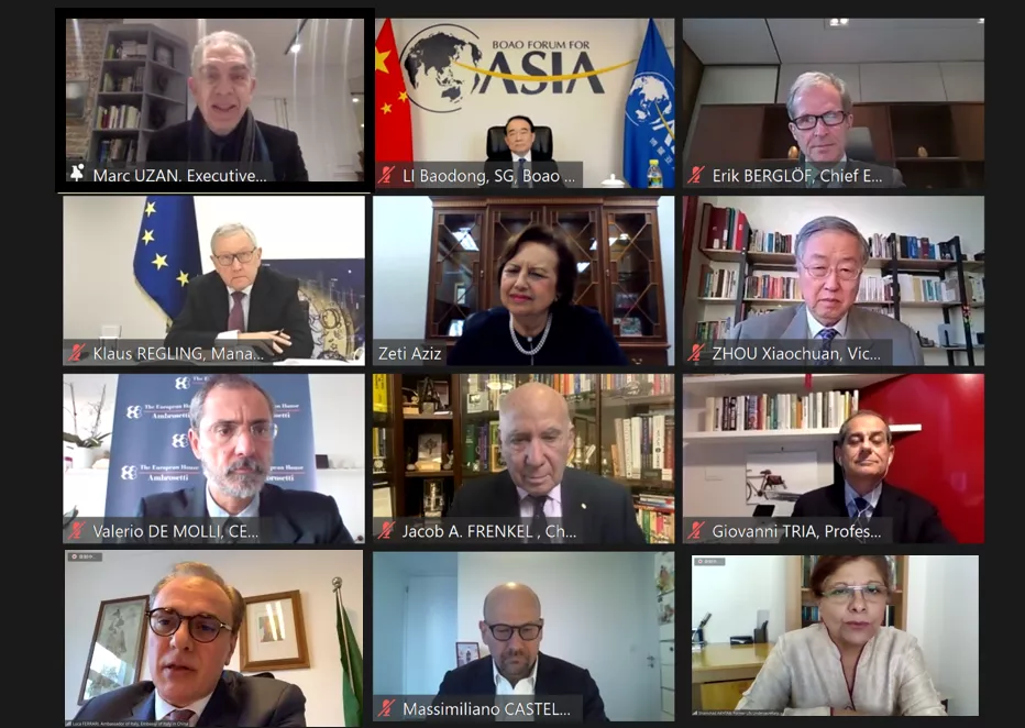2020年12月3日,博鳌亚洲论坛、意大利欧洲咨询联盟安博思集团、重建布雷顿森林体系委员会联合举行“亚欧合作对话”特别会议,来自亚洲与欧洲的20余位前部长级高官、央行行长、有关国际机构负责人、驻华使节以及博鳌亚洲论坛会员企业负责人等出席,围绕疫情对全球化的影响以及全球金融体系重塑,亚欧经济前景展望等重要议题进行了热烈深入的讨论。博鳌亚洲论坛副理事长、第十二届全国政协副主席、中国人民银行原行长周小川,博鳌亚洲论坛秘书长、中国外交部原副部长李保东,意大利财政经济部前部长特里亚,联合国原副秘书长、巴基斯坦央行前行长阿赫塔尔等出席会议并发言。