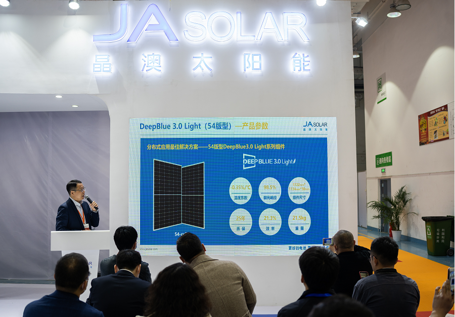 此次展会中,晶澳展出了包括新品DeepBlue 3.0 Light在内的DeepBlue 3.0系列高效组件,受到参会人员的广泛关注。该系列产品结合了新一代高效PERC电池技术PERCIUM+、掺镓硅片、MBB以及半片等技术,具备高转换效率、优异的发电能力和出色的可靠性表现,可广泛应用于不同场景,满足客户的多样化需求。