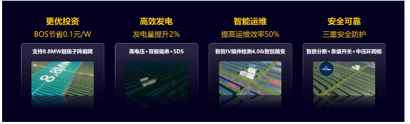±1500V双极智能组串:端到端1500V设备满足现有标准体系的前提下,支持3000V高电压、8.8MW大子阵,降低LCOE 7%,实现更优投资→BOS节省0.1元/W、高效发电→发电量提升2%、智能运维→运维效率提升50%、安全可靠→三重安全防护。
