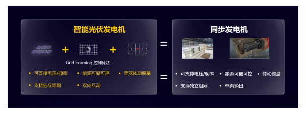 Grid Forming:使能光伏电压源属性,并网特性对标同步发电机,实现1. 智能光伏发电机 2. 可支撑电压/频率 3. 能源可储可控 4. 等效转动惯量 5. 支持独立组网 6. 双向互动等六大特性。
