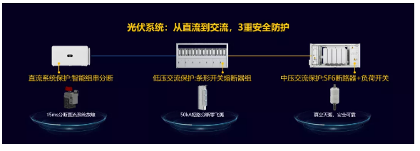 ▶ 光伏系统3重安全防护:从直流、低压交流到中压交流,通过智能组串分断+条形开关熔断器组+SF6断路器和负荷开关,实现端到端的安全;