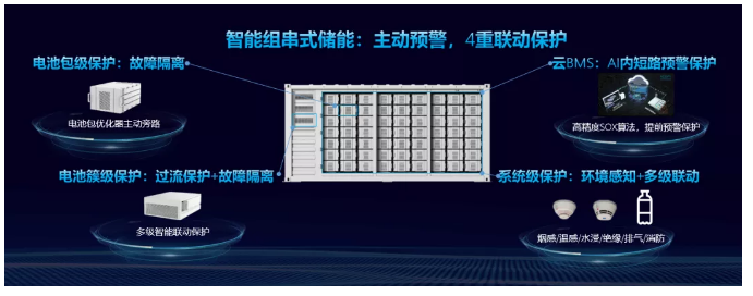 ▶ 智能组串式储能4重联动保护:从电池包级、电池簇级、系统级到云BMS,主动预警,从被动安全到主动安全。