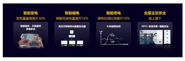 智能用电环节,华为带来了全新的数字化特性——AI光储协同。由于光伏发电与用电需求无法完全匹配,导致光伏发电一般仅能自用60%左右,大量的富余绿电被低价上网,影响收益。而AI光储用协同能有效提升用户绿电自发自用比率10%,用电成本降低5%: