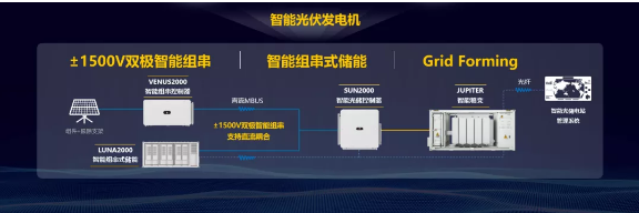 华为颠覆传统架构,打造面向未来的FusionSolar 8.0智能光伏发电机,包含±1500V双极智能组串+智能组串式储能,采用领先的直流耦合架构;基于华为Grid Forming智能光储协同控制算法,使光伏发电具备同步发电机的关键特性,让光伏发电可储可控,支持独立组网,可靠增强电网;能量流与信息流双向互动,度电成本进一步下降,构建高效、智能、稳定的光伏发电机,最终助力光伏成为主力能源。