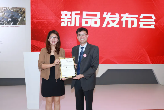 阿特斯HiKu7/BiHiKu7 210高功率组件也获得了国际权威认证机构的认可,在阿特斯新品发布会上,分别授予阿特斯210高功率组件新品认证证书,阿特斯组件事业部执行总经理邹珉作为代表,接受授牌。