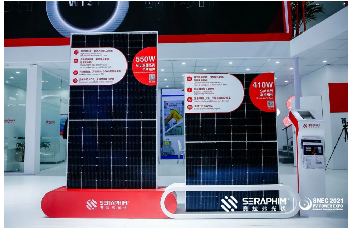 本次展会赛拉弗带来了采用210mm尺寸电池片的S5系列双面半片组件,最高功率可达670W,能够显著降低LCOE;采用182mm尺寸电池片的S4系列双面半片组件,具备卓越的稳定性和耐候性,专为大电站设计;采用166mm尺寸电池片的S3系列半片组件,弱光情况下发电能力出众。赛拉弗组件彰显高效优质“硬实力”,吸引了前来参展的客商久久驻足。
