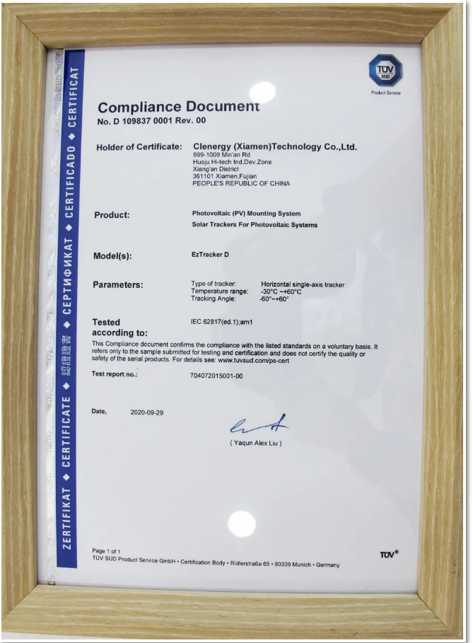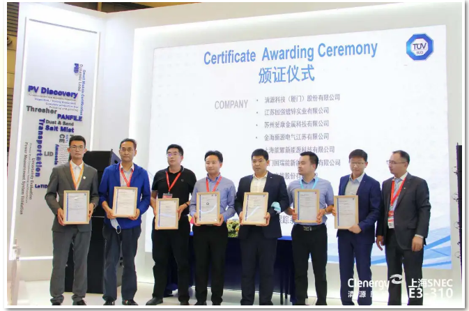 展会期间,清源股份获邀参与TUV南德第十五届SNEC展会跟踪证书授予仪式,获得跟踪支架产品TÜV SÜD证书。该认证表明清源股份具有技术优势和智能制造优势,产品达到国际一流水准。