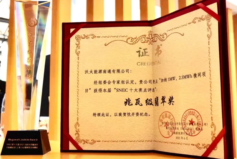 在SNEC十大亮点颁奖典礼上,沃太能源“加纳1MW,2.5MWh微网项目”荣获SNEC十大亮点兆瓦级翡翠奖。