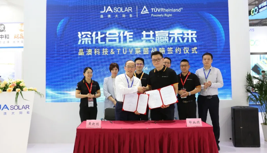 6月4日下午,“深化合作 共赢未来——晶澳科技&TÜV莱茵战略签约仪式”在晶澳展台隆重举行。德国莱茵TÜV大中华区太阳能服务副总裁邹驰骋,晶澳科技董事、高级副总裁黄新明等出席签约仪式。根据协议内容,双方将在产品性能分析与评估、户外发电实证等领域全面深化合作。