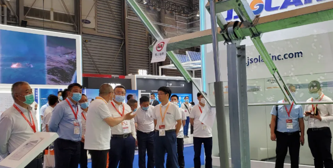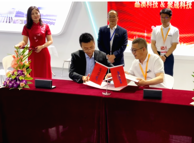 展会期间,光伏组件龙头企业晶澳科技与聚晟科技举行了战略合作签约仪式,未来公司将充分发挥自己在跟踪支架领域多年积累形成的核心技术优势,凭借晶澳科技在光伏行业的领先地位,共同推进系统化+智能化电站建设解决方案,不断降低大型地面电站的度电成本,助力“碳达峰”、“碳中和”目标的实现。