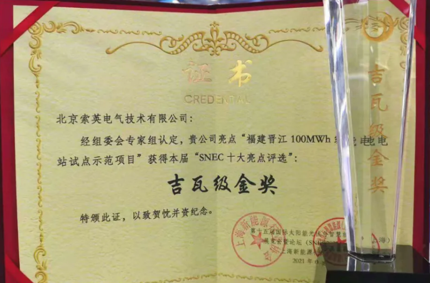 引领行业核心技术!索英荣获“2021十大亮点评选活动”吉瓦级金奖