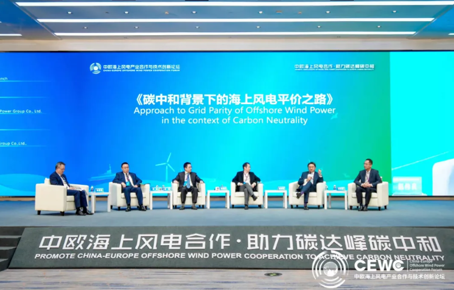 在行业高端对话环节,中国电建集团华东勘测设计研究院党委副书记、董事、总经理时雷鸣担任主持,中国长江三峡集团有限公司江苏分公司总经理袁英平、道达尔中国区总裁赵伟良、上海电气集团风电公司总裁缪骏、远景能源高级副总裁田庆军、中天科技集团有限公司总裁薛驰等人出席。嘉宾围绕“碳中和战略对海上风电带来的机遇和挑战”“欧洲海上风电平价发展历程及经验”“推动中国海上风电平价的关键要素与路径”等议题展开了热烈讨论。当日下午平行召开了海上风电开发与合作、海上风电技术与创新两个分论坛。