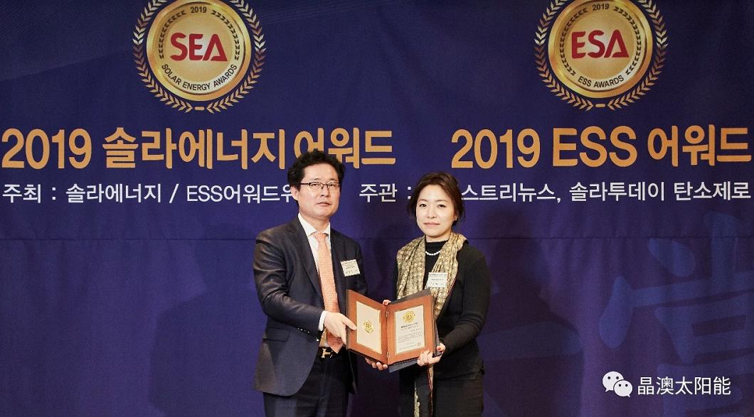 11月21日,2019韩国太阳能/ ESS产业颁奖典礼在韩国首尔隆重举行,晶澳太阳能凭借出色的光伏产品备受韩国市场认可,荣获”最佳市场表现奖”。