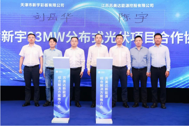 推介会分享了苏美达能源承建的LG新能源、创思特分布式项目案例。天津市新宇彩板有限公司、中国机床销售与技术服务有限公司、苏美达技术公司分别与苏美达能源公司进行现场签约。