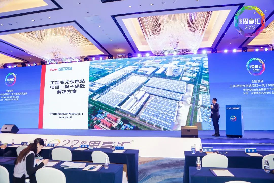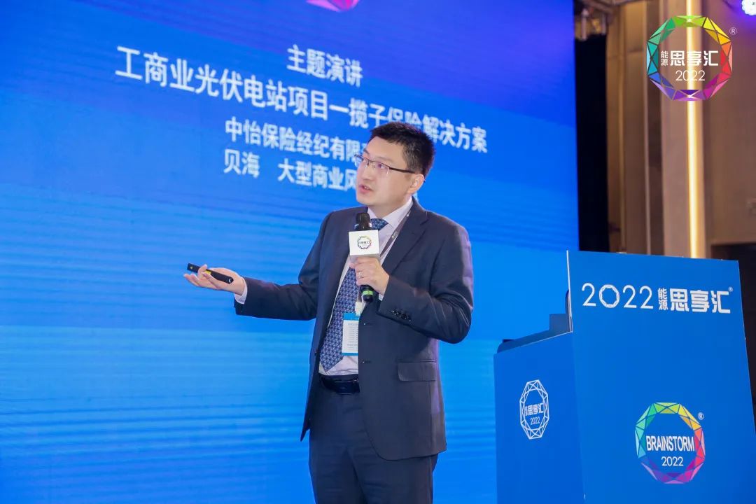 中怡大型商业风险部助理总监贝海先生受邀在大会上做了题为“工商业光伏电站项目一揽子保险解决方案”的主题演讲。在“双碳”大背景下,2021年国内分布式光伏装机容量首次超过集中式光伏,2022年上半年分布式光伏装机容量占全部装机容量的64%,其中工商业分布式装机容量占到全部的35%,可以说,工商业分布式光伏将引来爆发式的增长。