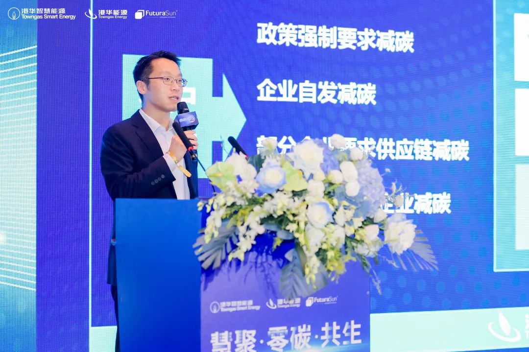 港华智慧能源执行董事暨可再生能源营运总裁邱建杭致辞表示,“无论是160年前点燃香港的第一盏煤气灯,28年前顺应国家清洁能源政策为内地提供燃气服务,还是6年前成立港华能源,以综合智慧能源助力国家双碳目标实现,始终不变的是港华以清洁能源发展为初心的企业传承。碳达峰、碳中和是大家共同的事业,港华能源将始终坚持以“综能化、去碳化、数字化”的三大零碳战略发展方向,联合零碳生态力量,通过为客户提供分布式光伏、储能、充换电、节能、绿电及CEA碳配额等服务,助力国家碳中和。”
