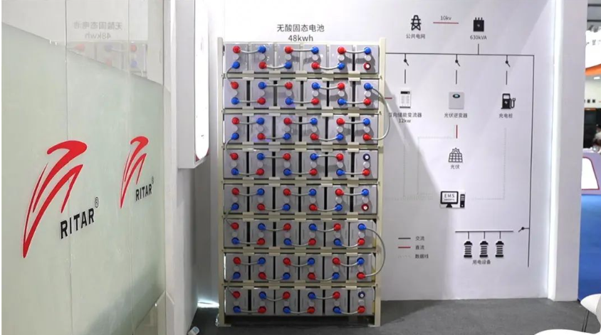 除了锂电产品展示,瑞达集团还呈现了智慧安全的无酸固态电池储能系统。无酸固态电池(学术名称OPzV固态铅电池),是瑞达电源研发、生产制造的新型储能用环保固态电池。无酸固态电池采用纳米级气相二氧化硅作为电解质,是百分百固态结构,没有硫酸液体不存在泄露,不起火不爆炸。其设计满足深循环充放电、高循环寿命、大容量储能及可再生能源等特点。设计寿命25年,电池循环寿命5500次,同等情况下,其循环寿命相比常规电池提升约4-5倍。