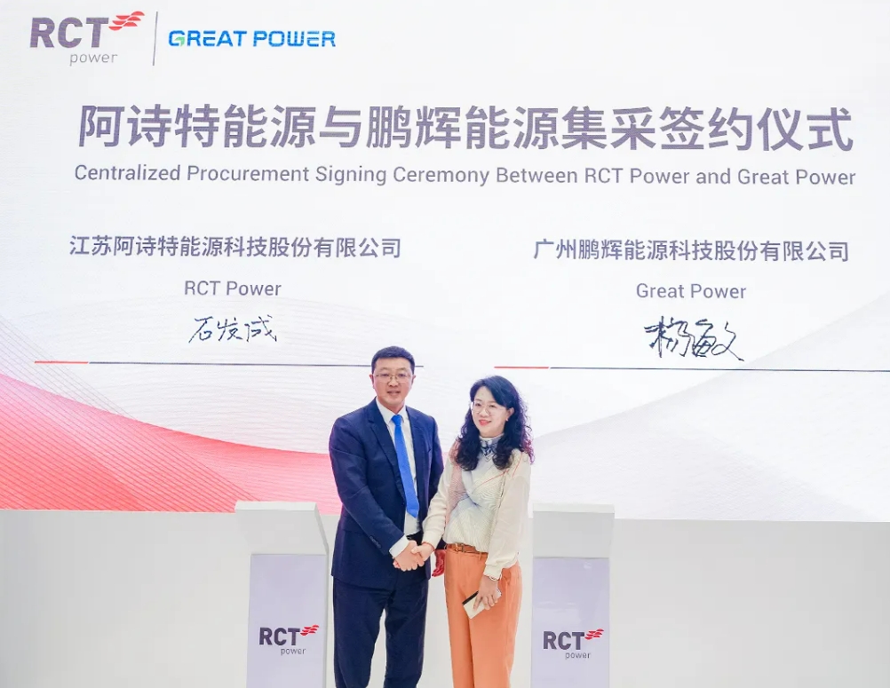 阿诗特能源总经理石发成与广州鹏辉能源科技股份有限公司储能事业群总裁杨敏共同签订了储能系统设备集采协议并合影留念。在2024年度,鹏辉能源将向阿诗特采购储能系统及配套设备百兆瓦时,应用于北美市场的表前及表后场景。本次合作,双方将进一步携手拓展北美储能市场的各类应用。