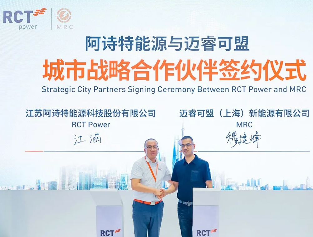 阿诗特能源销售总监江涵与迈睿可盟(上海)新能源有限公司总经理穆建峰就华东区域工商业储能项目合作开发共同签订了城市战略合作伙伴协议并合影留念。