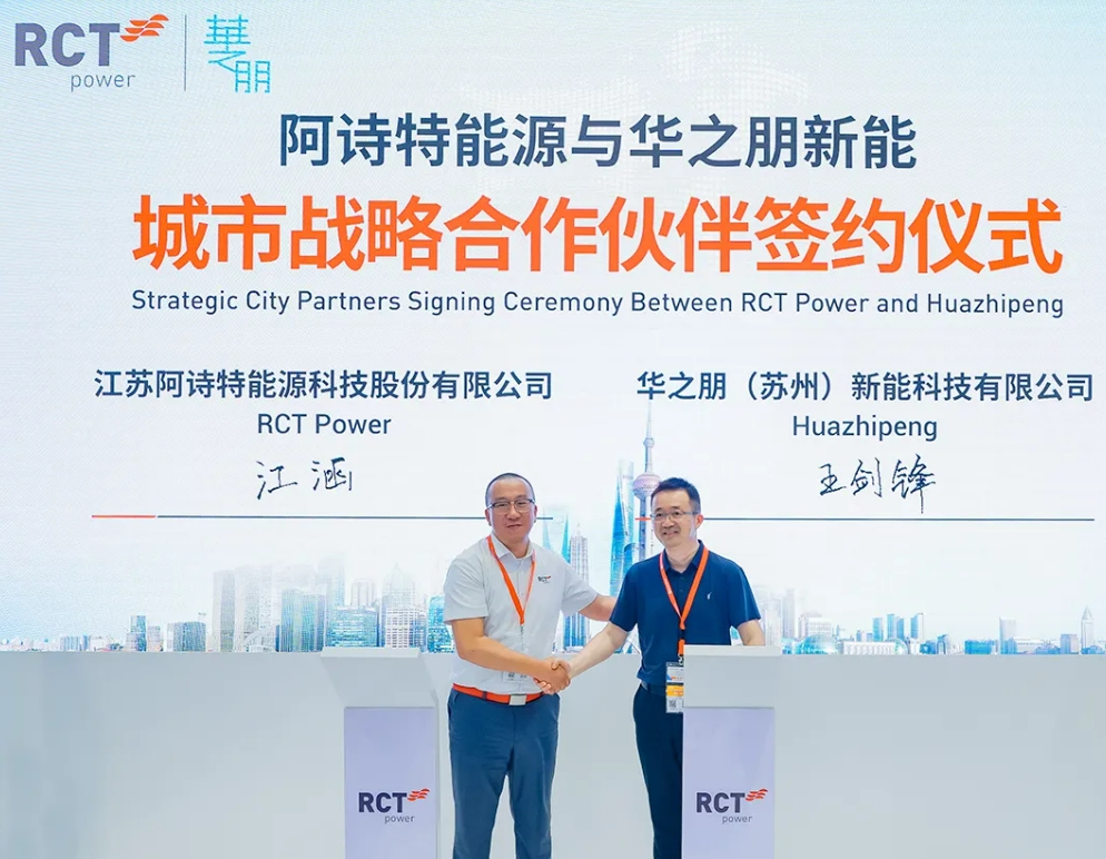阿诗特能源销售总监江涵与华之朋(苏州)新能科技有限公司总经理王剑锋就华东区域工商业储能项目合作开发共同签订了城市战略合作伙伴协议并合影留念。