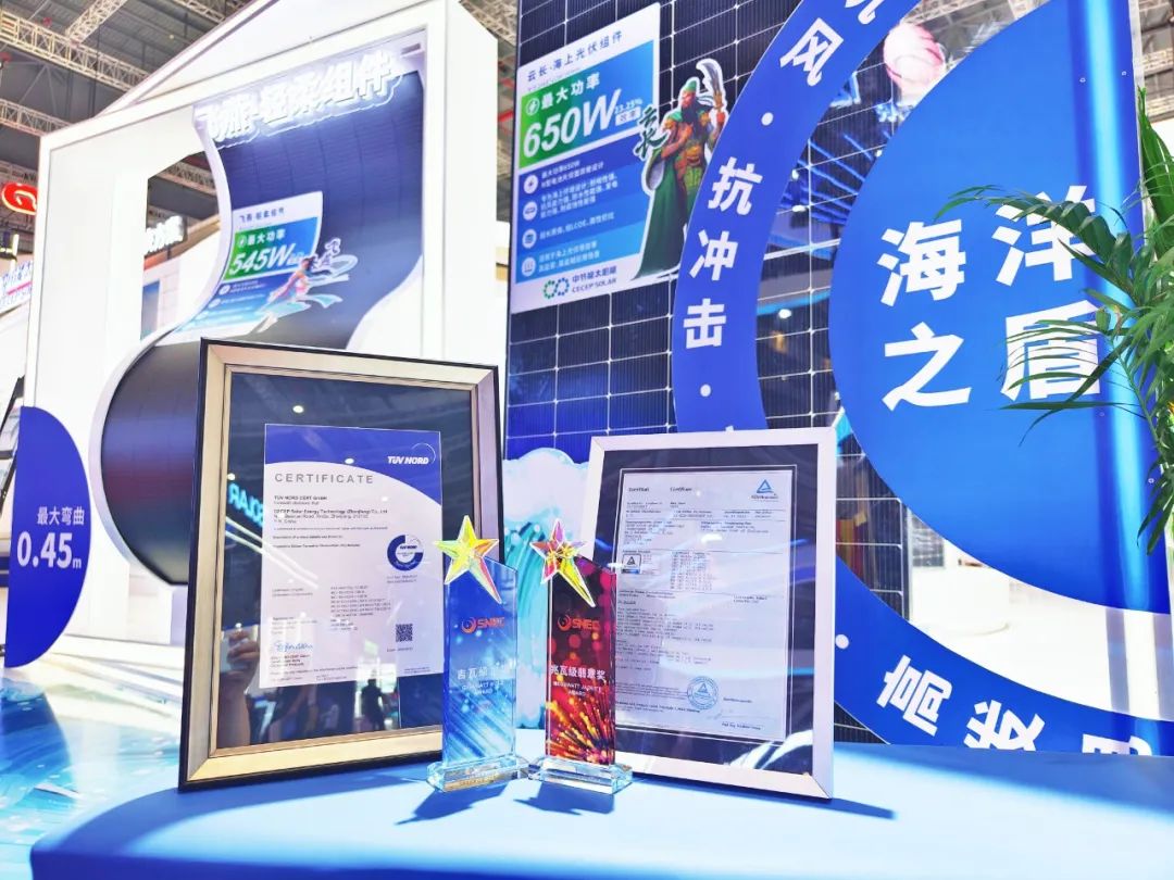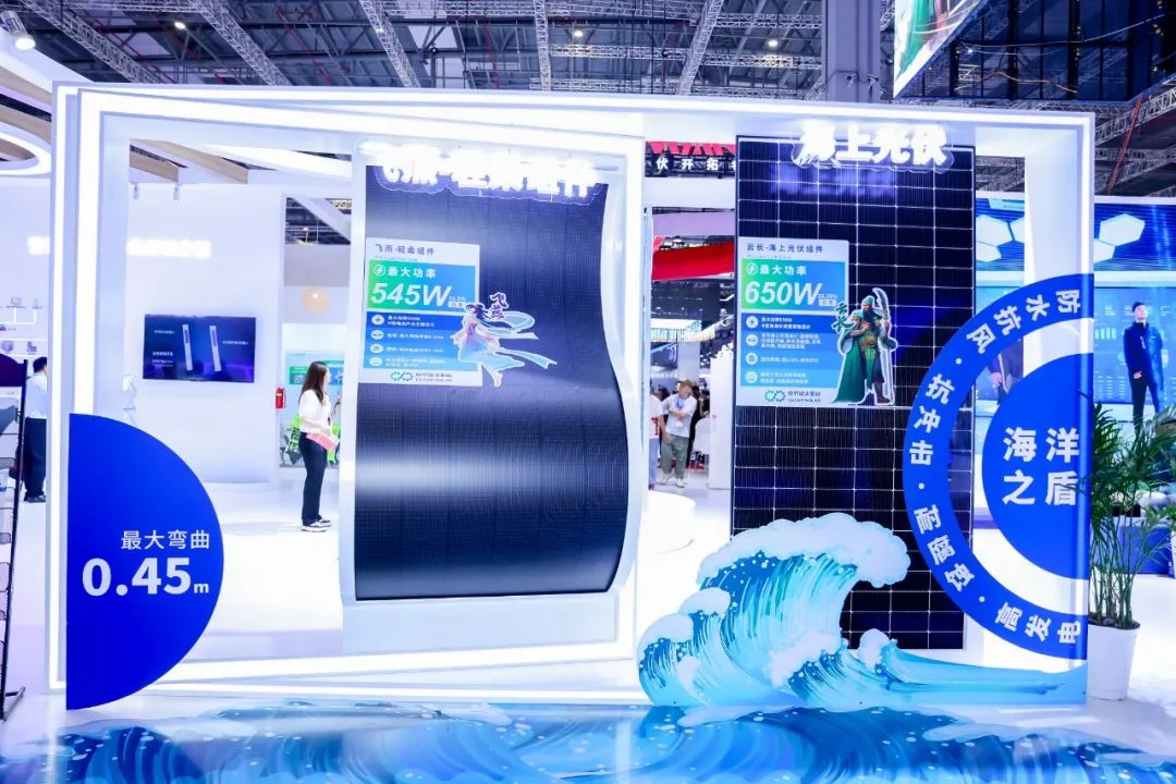 镇江公司共展出云长TOPCON高效双面组件、飞燕柔性组件、青天全黑组件、女娲BIPV组件等四大系列产品,以满足全球客户多样化、多场景产品需求。特别是飞燕柔性组件,组件前板材料采用三层复合材料,与竞品相比,在耐高低温、耐腐蚀、耐候性方面更为出色,同时兼具低碳、环保、高效、节能的特点,以及更强的抗冲击、抗冰雹能力,在给客户带来更高发电量同时,也更具安全性。