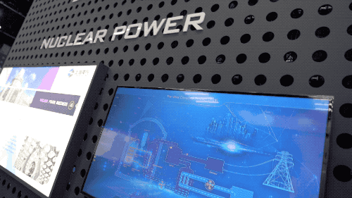 核电打破传统展示方式,运用触屏技术与观众互动,生动地展示了上海电气的核电板块的综合实力。在核电领域,上海电气已成功实现了二代加、三代AP1000、EPR、华龙一号及四代高温气冷堆核电主设备产品的批量化、配套化交付。