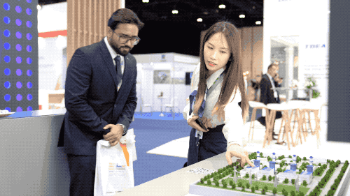 迪拜光热光伏混合电站是展区的全明星项目,马克图姆太阳能园区第四期950MW光热光伏发电项目建成后,每年将为迪拜270000多家住户提供清洁电力,减少140万吨碳排放量。