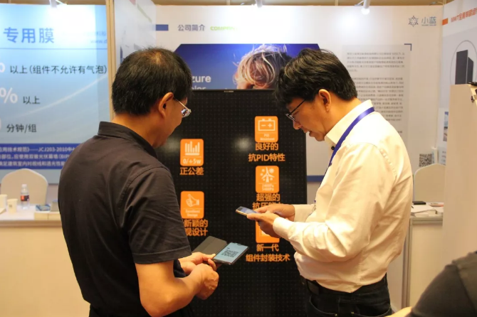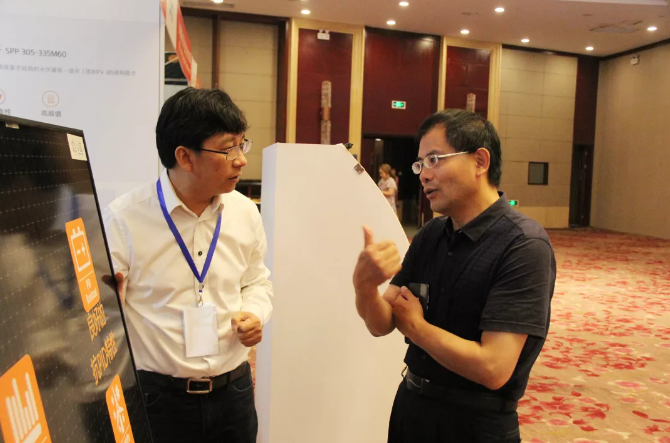 现场展出的全黑单晶高效组件和MWT柔性单晶硅组件两款产品受到了现场众多光伏建筑行业参会人员的密切关注,更得到了国务院原参事、中国BIPV联盟荣誉主席石定寰参事,中国建筑设计院副总设计师、中国建筑学会秘书长仲继寿等行业大咖的垂询,公司总裁李军耐心的介绍了当前行业内的痛点,以及MWT组件的应用优势,并积极表态在新一轮的产业变革中,南京小蓝将抢抓机遇,前瞻布局,加速传统光伏的智慧转型,各界人士给予MWT产品高度评价,纷纷拍下组件照片,并且获取工作人员微信,相继表示会后将加强交流与合作。
